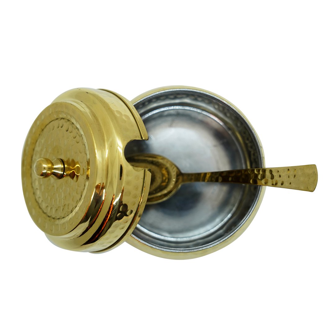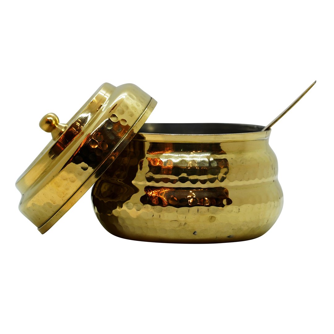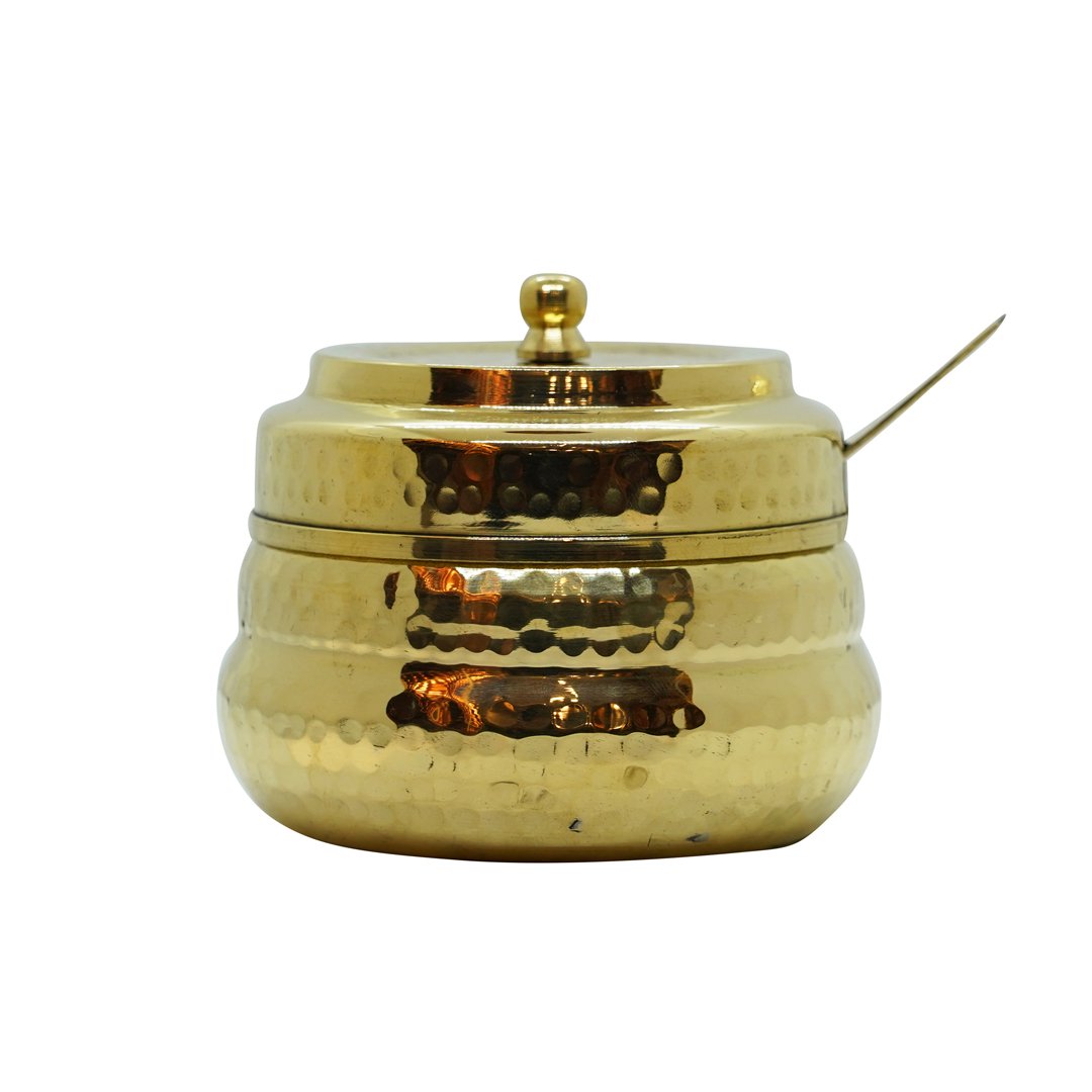 Preserving flavours is an integral nature of brass, and this traditional brass ghee pot with spoon and easy-fit slotted lid is perfect to store ghee as it has been done for generations. Naturally durable, our brass ghee pot helps maintain the quality, aroma, and authentic richness of ghee. While the golden glow of the brass finish gleams with aesthetic appeal, the well-fitted lid of this ghee pot brass allows easy access with good protection. This brass ghee container is ideal for everyday use.