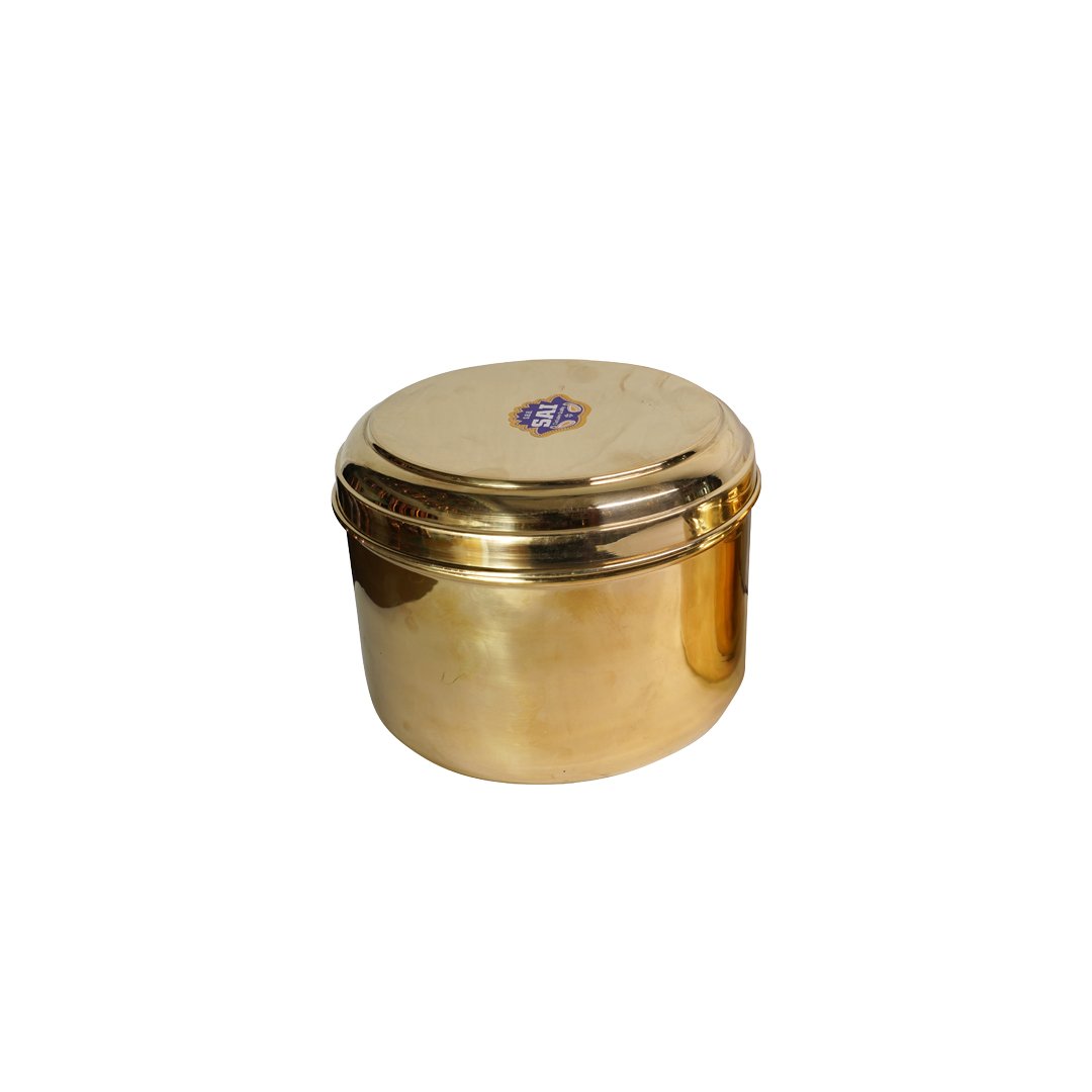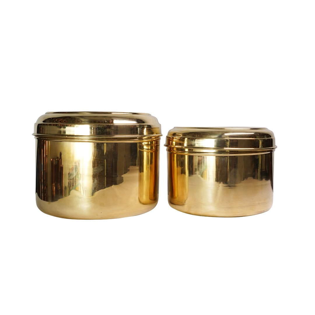 Taking pride of place as a classic storage essential in your kitchen, our charming brass katordans with lid charm with durability and functional efficiency. Our brass katordans are designed for utility, aesthetic appeal, and longevity. While the broad opening helps easy access, the sturdy lid offers secure grip. Simple to use and clean, our brass katordans are perfect to store dry ingredients, staples, and festive snacks. Makes an ideal return gift option too!
