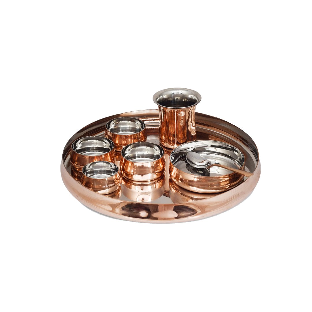 Embrace heritage and the core essence of Indian dining with this exquisitely crafted copper steel 8 pcs thali set with a sleek hammered finish. Each piece charms with a smooth stainless steel interior and a sturdy hammered copper exterior. While the vintage Copper finish lends a warm, regal gleam to your dining experience, the steel thali price is easy on your pockets too! As this royal copper steel thali set is easy to clean and maintain, it is perfect for everyday dining, festive occasions, and gifting.